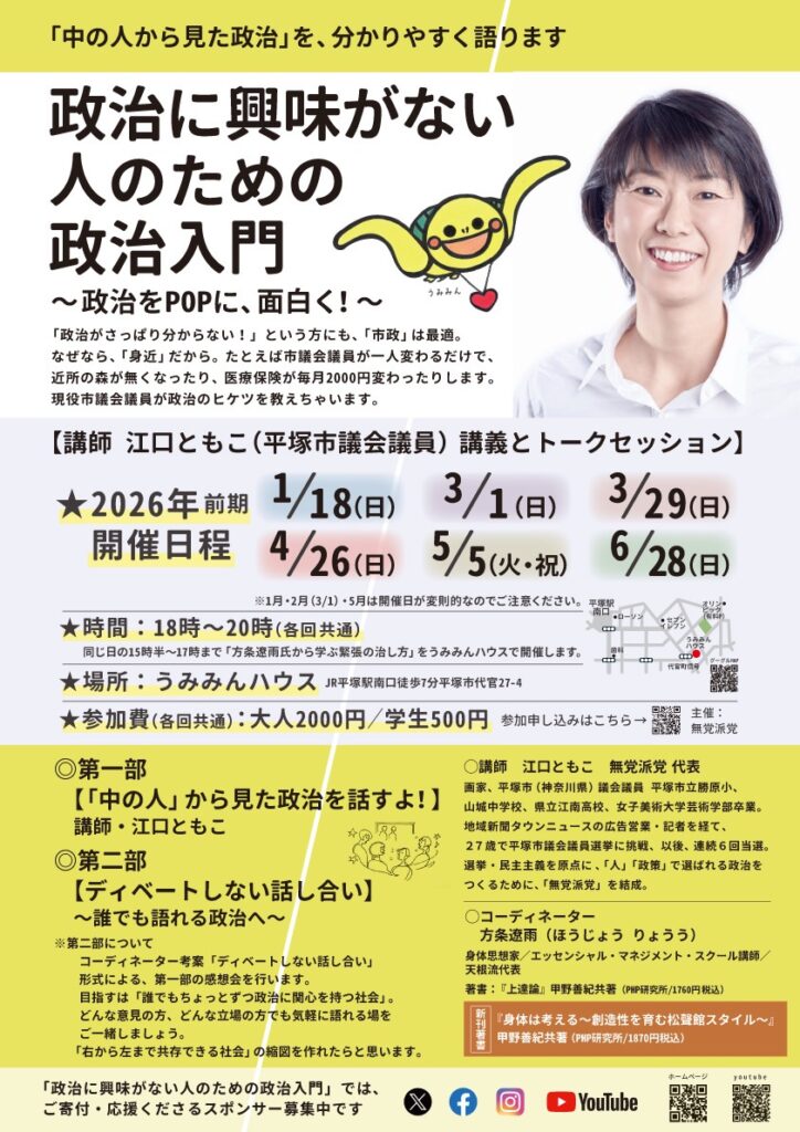 衆院選が確実視されるなか、政治家をどうやって選べばいいのかをテーマに話します。緊急スペシャル!!ぜひいらしてください。衆院選の前哨戦とも言える福島県南相馬市市長選挙(本日1/18投開票)に立候補したさくらい勝延さんの戦い方も話します。
